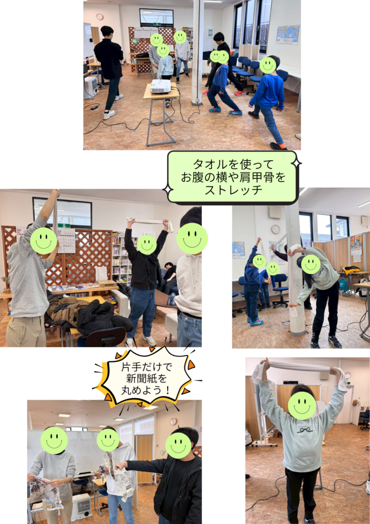 タオルストレッチはお家でもできそうですし、新聞紙のストレッチはゲーム感覚で行えるので、大人も子どもも楽しんで取り組んでいました(*^^*)片手だけで新聞紙を丸めるのは、結構腕の筋肉を使うんですよ!ぜひお家でも親子でやってみて下さい♪左右差もあったり、日頃腕の筋肉を使っていないと大人でも難しいかもしれません🤣