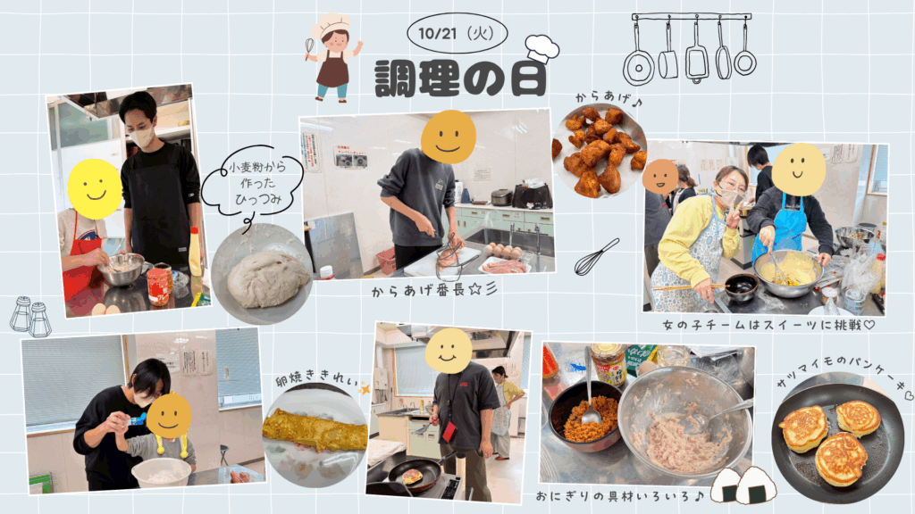 秋は「食欲の秋」でもありますね🍁事前にみんなでメニューを決めて、季節の野菜や郷土料理を含めた約5品を作りました。当日みんなで調理分担を決めてスタート!